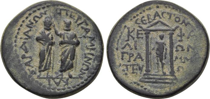| MYSIE -Pergame(/Auguste)- Bronze(br)(c.10av)(21mm-5g) | SELEUCIE -Laodicée- Tétradrachme(ar)(c.45av)(30mm-15g) |