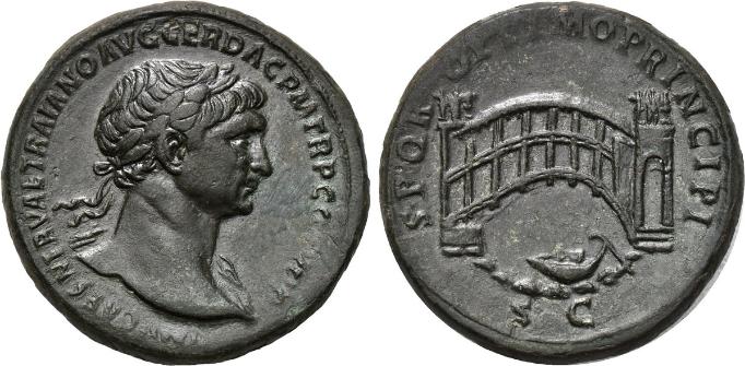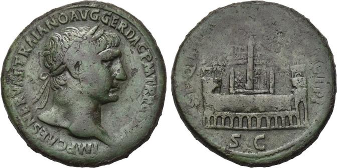 | ROME-Trajan(98-117)- Dupondius(br)(c.105)(23mm-15g) | ROME-Trajan(98-117)- Sesterce(br)(c.110)(35mm-26g) / Circus Maximus |