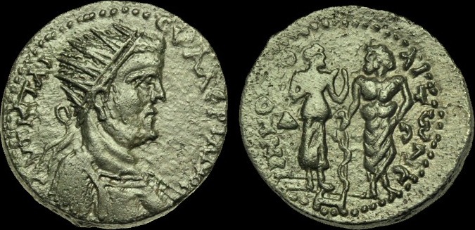 | INDE(EMP.KUSHAN) -VasudevaII (290-310)-Dinar(or)(21mm-8g) | EGYPTE-Alexandrie(Valérien 1)(253-260)-Tétradrachme(br)(22mm-11g) |