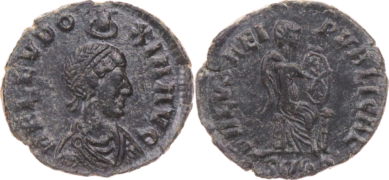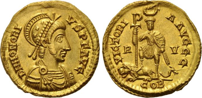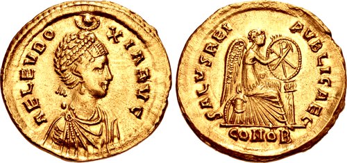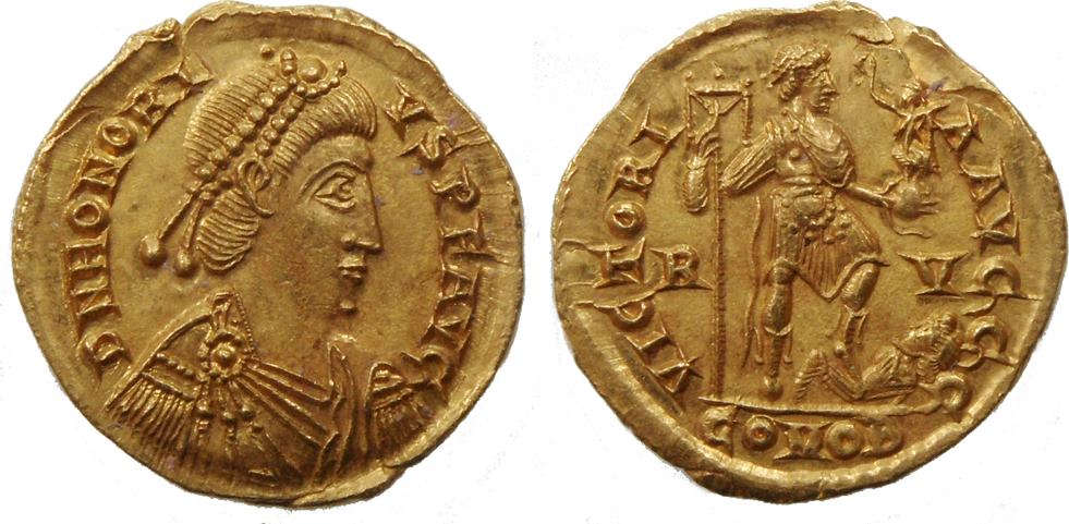 | ROME-Eudoxia(395-404)-Nummus(br)(c.402)(18mm-2.1g) | ROME-Honorius(393-423)-Solidus(or)(Ravenne)(c.405)(21mm-4.5g) |