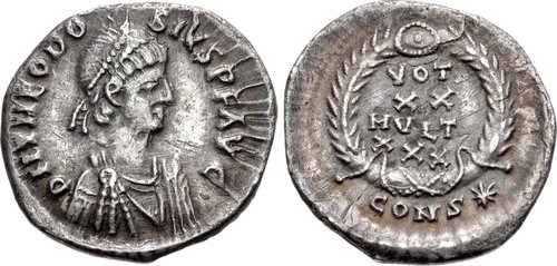 | ROME-ThéodoseII(402-450)-Silique(ar)(18mm-2g) | FRANCS du Rhin-(400-450)-Nummus(br)(8mm-0.3g) F |