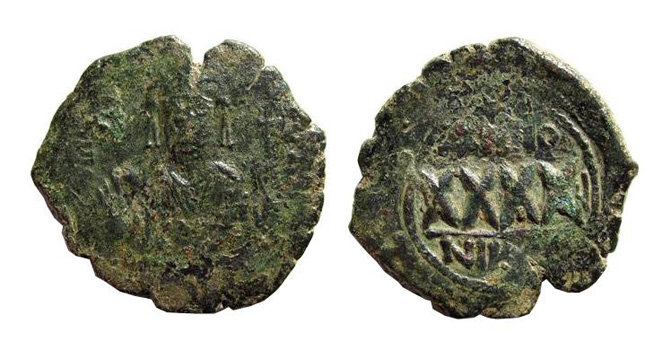 | EMP.BYZ.-ConstansII(641-68)-20nummi(br)(Carthage)(c.645)(20mm-6.2g) | VISIGOTHS-Triente(612-621)-Trémisse(or)(c.615)(18mm-1.47g) |