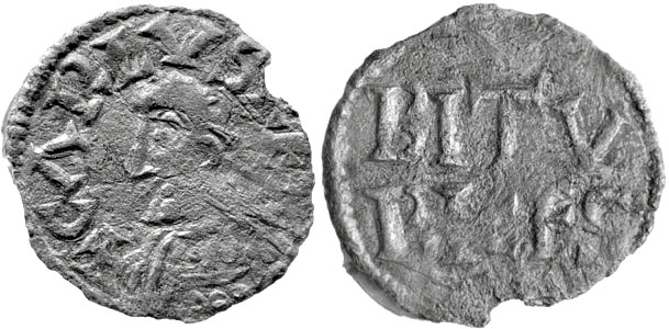 | EMP.BYZ.-BasileI(867-886)-Bronze(br)(c.880)(20mm-3.9g) | CAROL. -Charles le Ch. -(843-877)-Denier(ar)(c.865)(Bourges)(20mm-1.1g) |