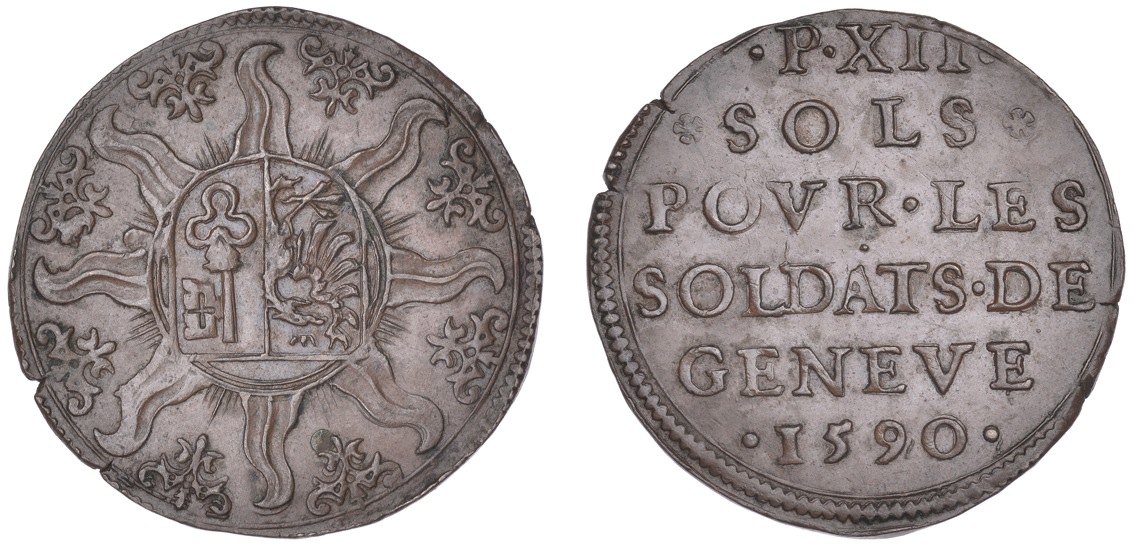 GENEVE(Siège) -12sols(cu)(1590)-(6g) MOGHOL(Emp.)-Akbar(1556-1605)-Square Rupee(ar)(16mm-12g)