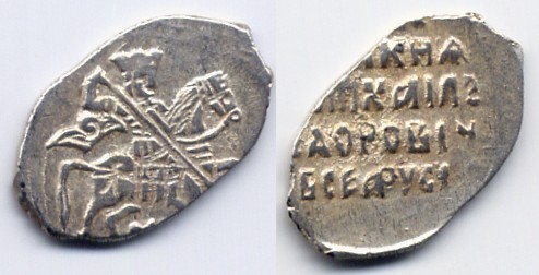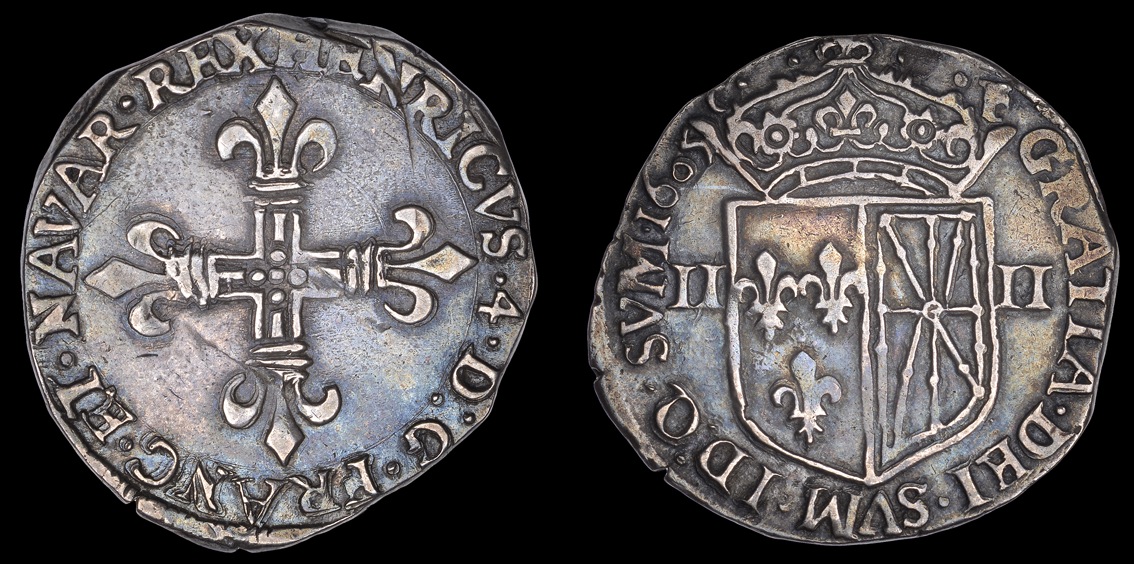RUSSIE- Fedor Romanov-Kopek(ar)(15mm-0.7g)(c.1625)    FRANCE-Henri IV- 1.4-écu(ar)(1605)(30mm-9.5g)