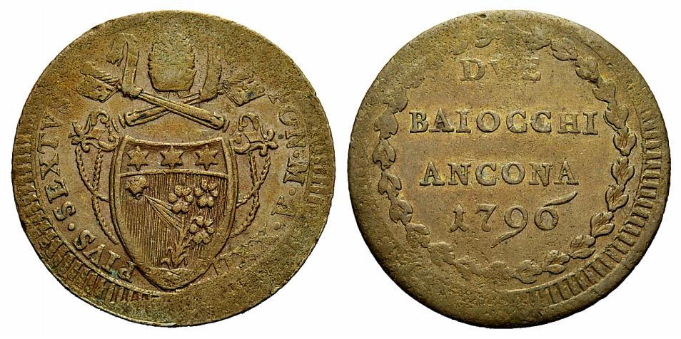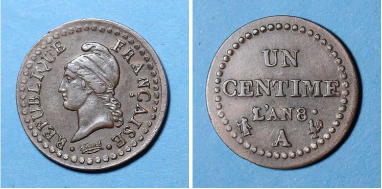 | ITALIE-Ancône(Pontif.-PieVI) -2-Baïocchi(cu)(1796)(19.9g) | FRANCE-Consulat(1799-1804)-1-centime(br)(1799)(19mm- --g) |