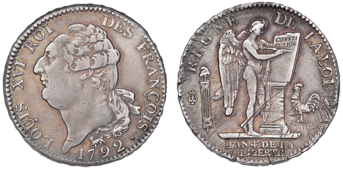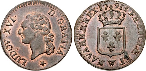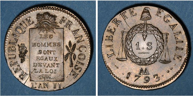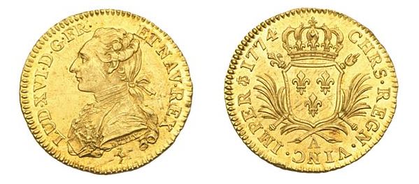 | FRANCE-Convention(1792-1795)-Sol aux balances(br)(1793)(34mm- --g) | FRANCE-LouisXVI(1774-1792)-Louis aux palmes(or)(1774)(23mm-8g) |