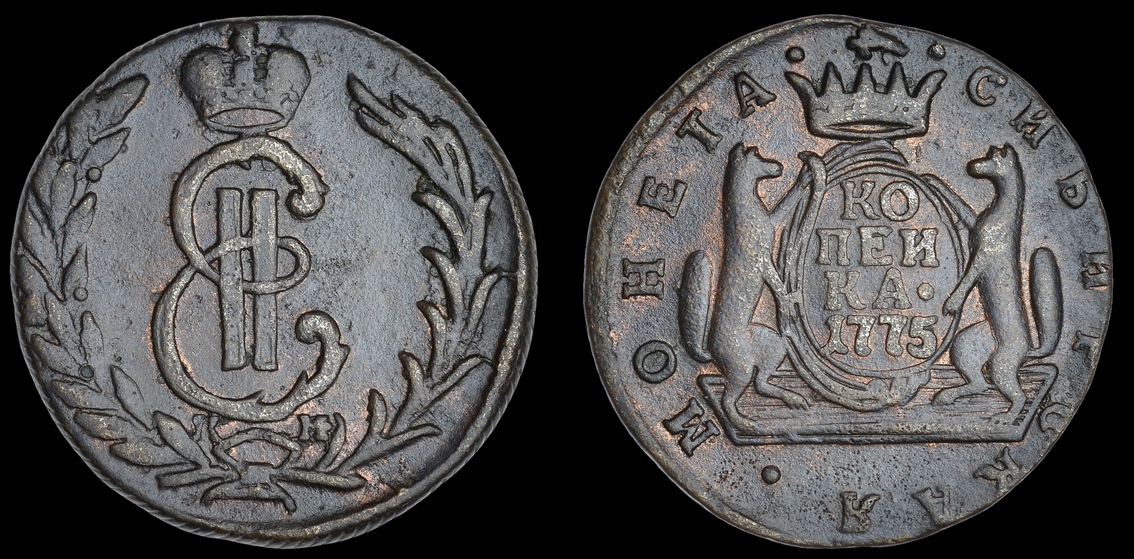 | RUSSIE-Sibérie-Kopek(cu)(1775)(30mm- --g) | PAYS-BAS-Hollande-7-Gulden(or)(1760) |