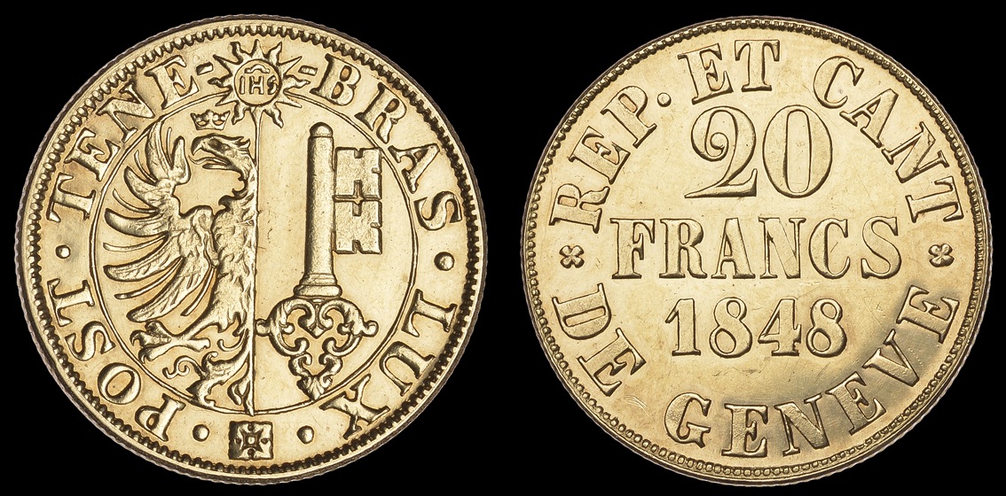 | FRANCE-NapoléonI-5francs(ar)(an13=1804)(--mm- --g) F | GENEVE(Rep.)20francs(or)(1848)(--mm- --g) |