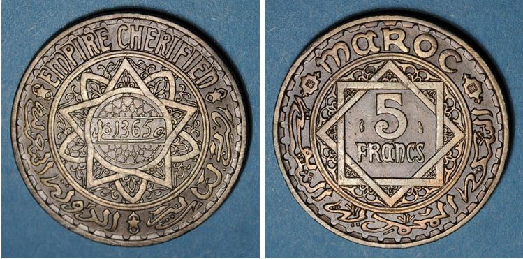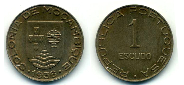 | MAROC-Mohammed V- (Protectorat) -5-francs(al-br)-(1365/1946) | MOZAMBIQUE- (Rep. Portug.) -1-escudo(cu-ni)-(1936) |