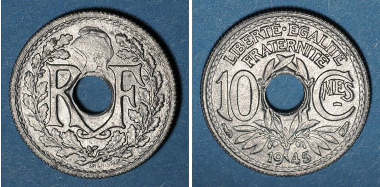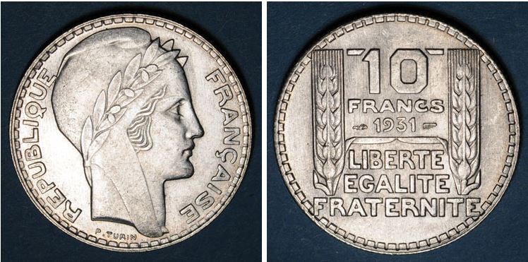 | REP. FR.-Gouv.Provis.(1944-47)-10-centimes(zn)(1945) | FRANCE-3è REP.(1870-1940)-10-francs(ar)(1931) |