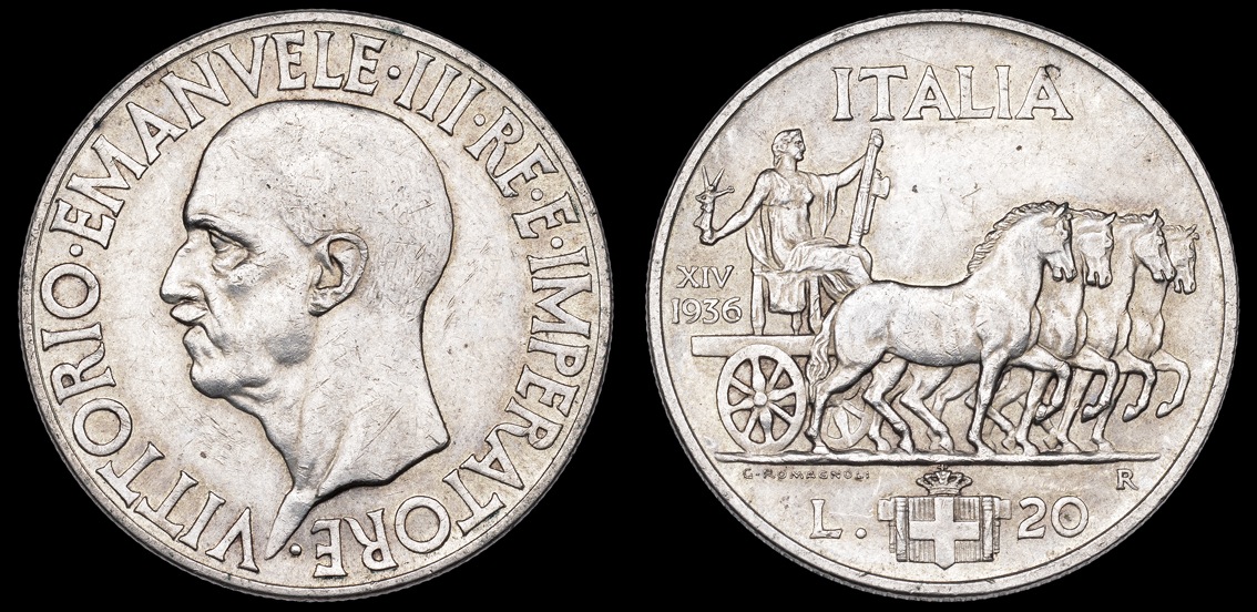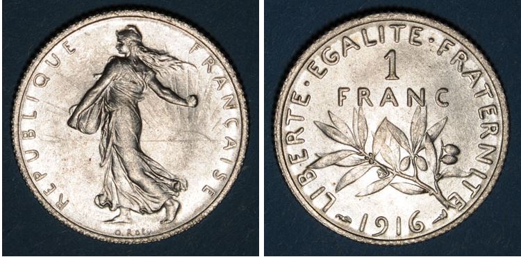 | FRANCE-3è REP.(1870-1940)-1-franc(ar)(1916) | ITALIE(Roy.)-Victor Emm.III-20-Lire(ar)(1936) |