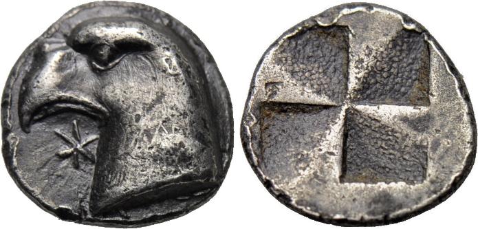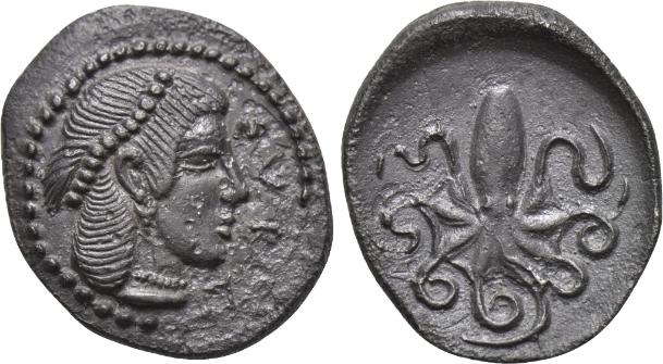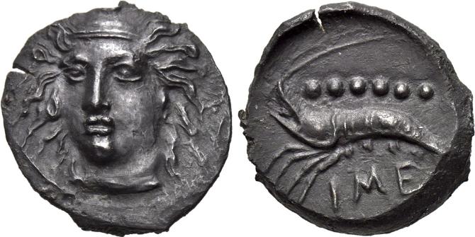 | ASIE MINEURE-Kymé-Hémiobole(ar)(c.450av)(5mm-0.5g) | SICILE-Himère-Hémilitra(ar)(440-415av)(11mm-1.7g) Nymphe / Ecrevisse |