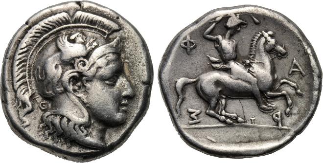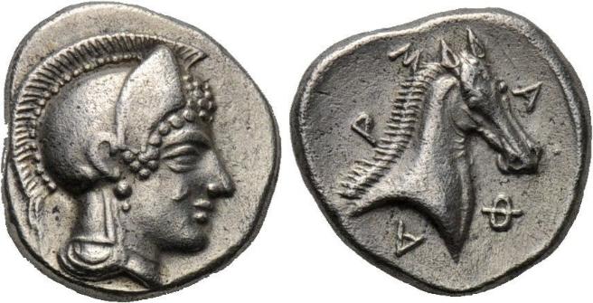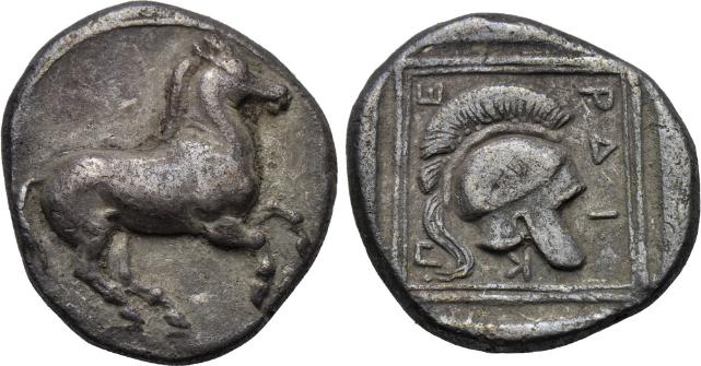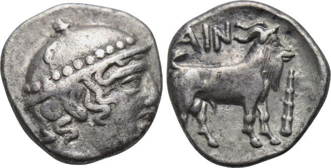 | THRACE -Aïnos-Diobole(ar)(c.425av)(11mm-1.1g) | GRECE(THESSALIE)-Pharsale-Drachme(ar)(c.425av)(19mm-6g) |