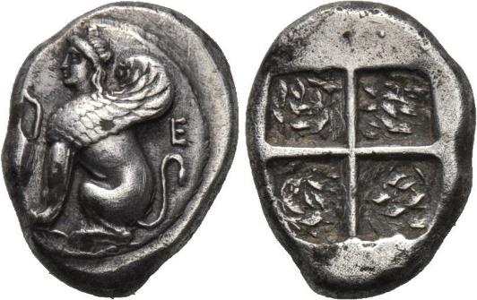 | SICILE-Syracuse-Drachme(br)(390-375av)(28mm-32g) Athéna / Dauphins F | IONIE-Chios-Drachme(ar)(399-380av)(16mm-1.7g) Sphynx/ |