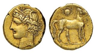 | CARTHAGE-(264-241av)-Tridrachme(el)(20mm-10g) Tanit / Cheval | SICILE-Syracuse-HiéronII(275-216av)-Bronze(br)(34mm-36g) F |