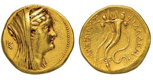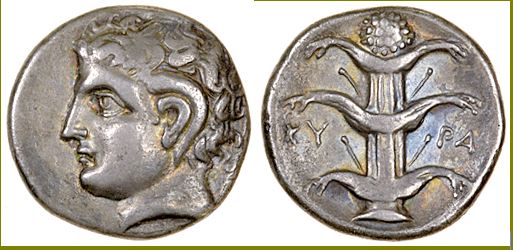 | EGYPTE-(Roy.Ptolém.)-Octodrachme(or)(c.290av)(32mm-27.5g) | CYRENAIQUE-Cyrène-Didrachme(ar)(c.270av)(21mm-7.73g) ( / Silphium) |