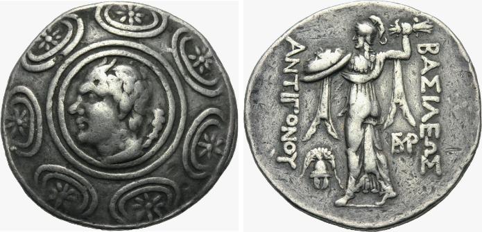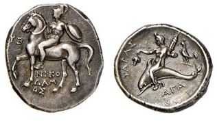 | ITALIE-Tarente-(280-272av)-Statère(Didrachme)(ar)(20mm-8g) | MACED.ROY. Antig. Gonatas.-Tétradrachme(ar)(c.260av)(30mm-17g) |