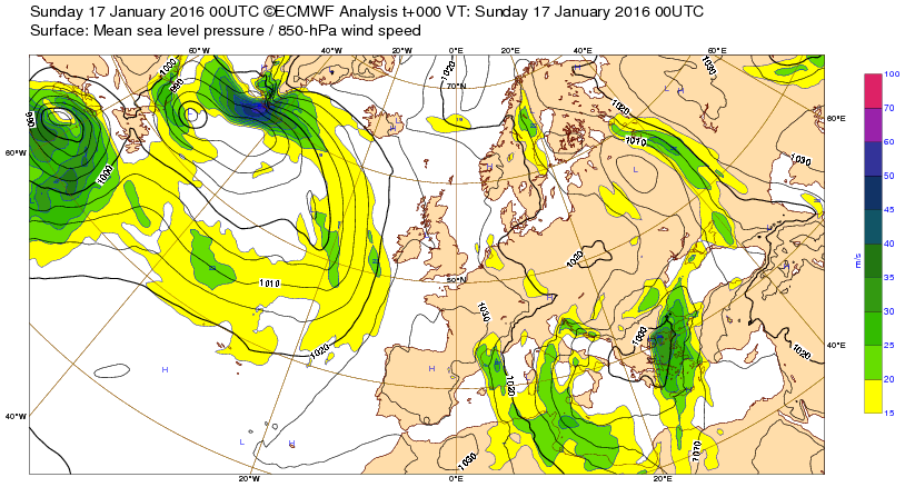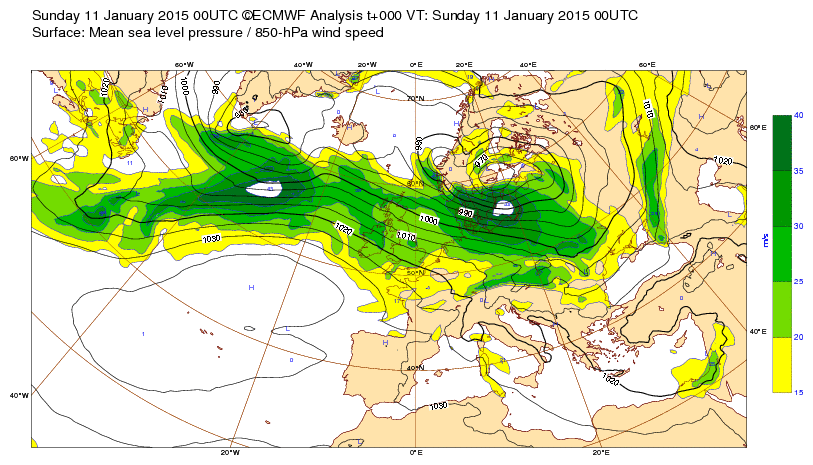 Di 11 janv 15 à 11h00 : ... Et voici la carte de la situation observée le jour J : l'anticyclone a rejeté plus au nord les vents forts mais le type de situation est identique.