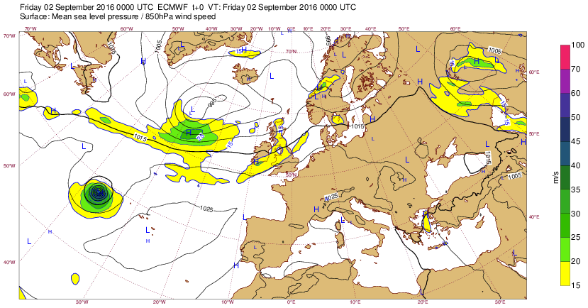Ma 15 sep 15 à 14h00 : ..Ce sont bel et bien les restes d'"Henri" qui nous arrivent, cet ancien cyclone passablement comblé depuis les Tropiques mais qui se creuse à nouveau (979mb) au large de nos côtes pour un simple coup de vent d'équinoxe un peu en avance sur le calendrier mais qui donnera son lot de vent fort et de précipitations soutenues sur une bonne partie de la France : Situation pour le Me 16 sep 15 à 08h :