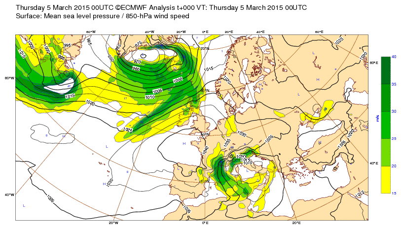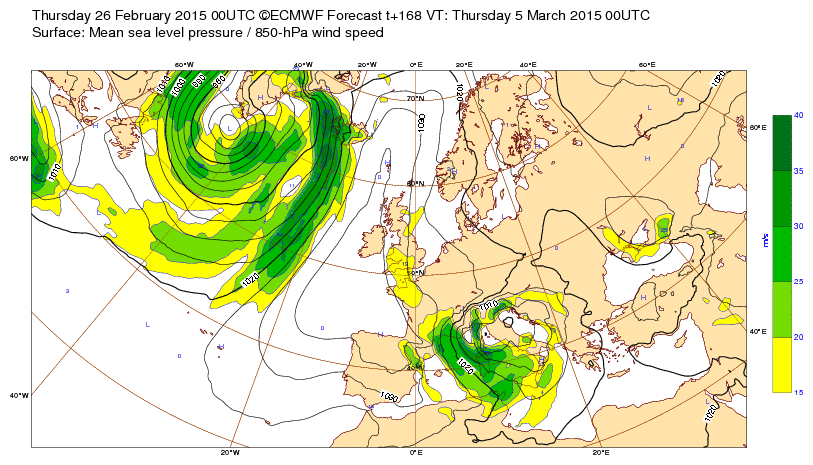 Je 26 fév 15 à 11h00 : ...Creusement très rapide en Méditerranée entre le 4 et le 5 mars (dû à l'avance des hautes pressions sur le continent et à la descente d'air froid qui s'ensuit :