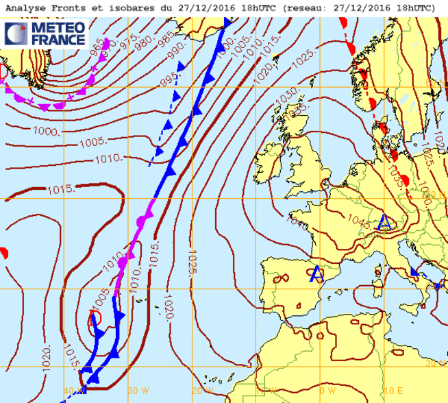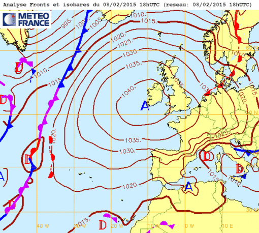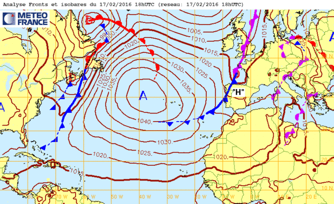 Je 18 fév 16 à 11h00 : Un mastodonte sur l'atlantique ! Après les "super creux" (ci-dessous), les "super-pleins" avec ce remarquable anticyclone d'hiver de valeur 1050mb à son "sommet" !
