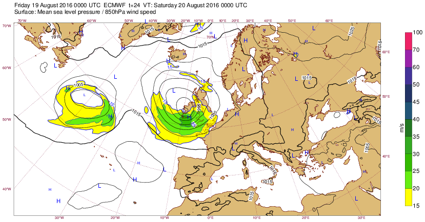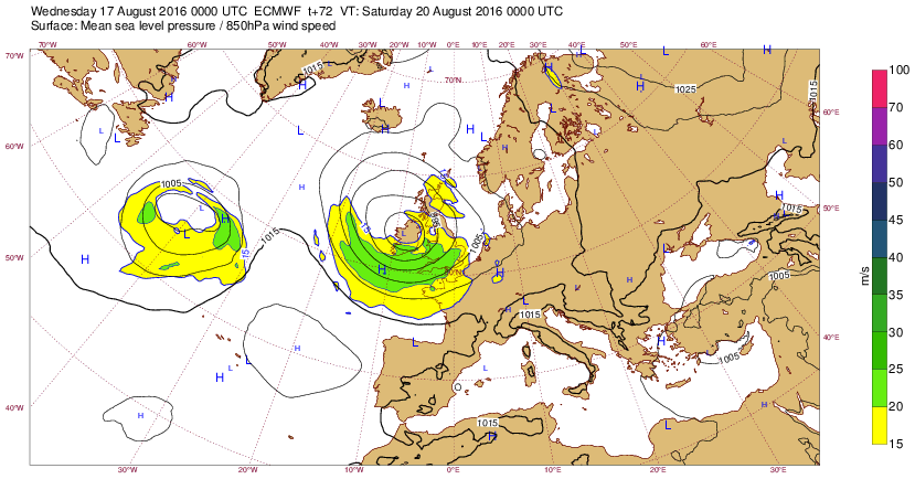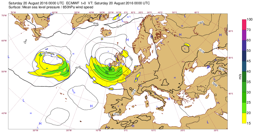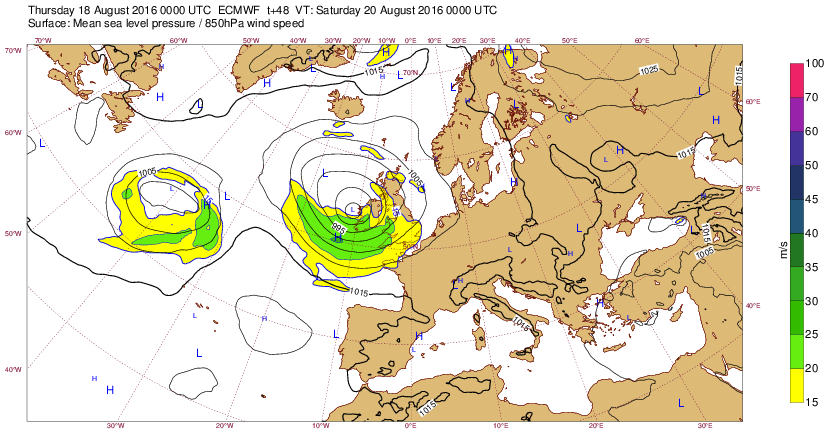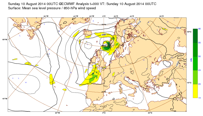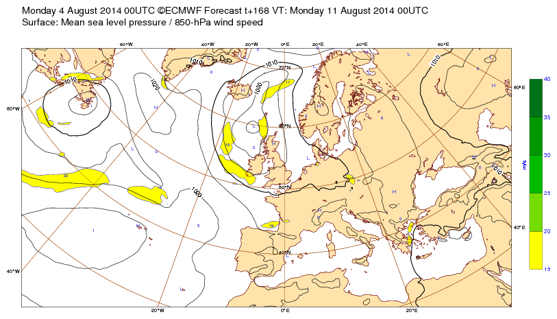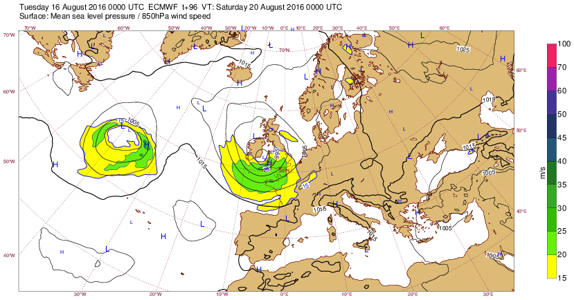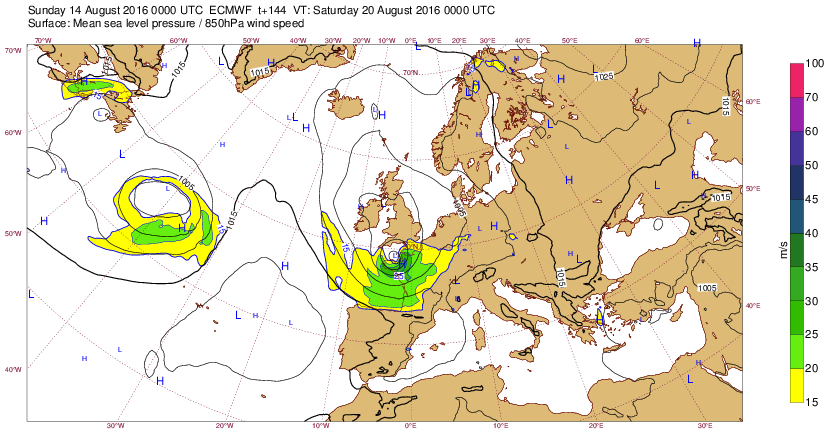 Di 14 août 16 à 11h00 : Comme cela ne se produit plus très souvent, signalons ce creusement (<990mb) sur la pointe Bretagne prévu (J-6) pour le sa20 à 00h-tu. : (probable Coup de Vent 8-9 localement ?)