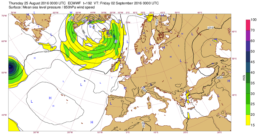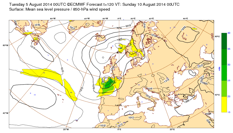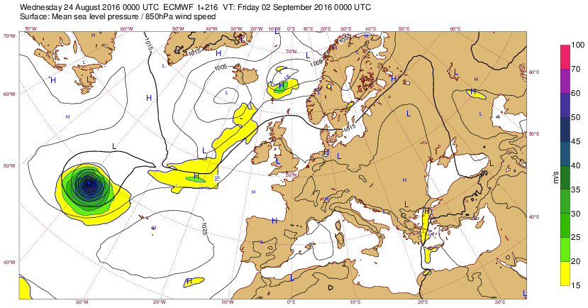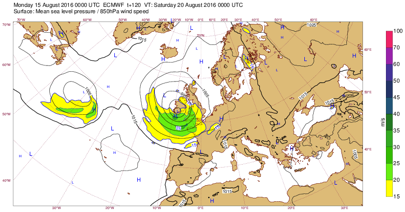 Lu 15 août 16 à 11h00 : (Suite de ci-dessous) : prévi à (J-5) : (la dépression est + creuse (<985mb) mais centrée plus au N )