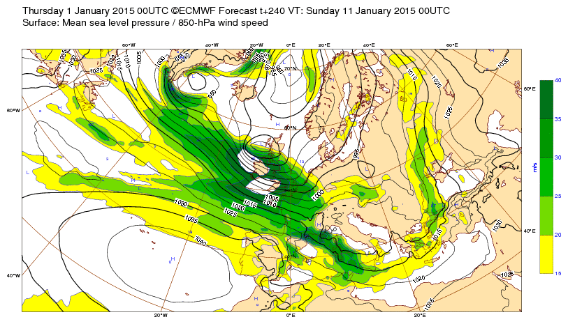 Lu 5 janv 15 à 11h00 : ... Carte maintenant prévue pour le même jour (J-6) : le changement est déjà là, l'anticyclone poussant une dorsale...