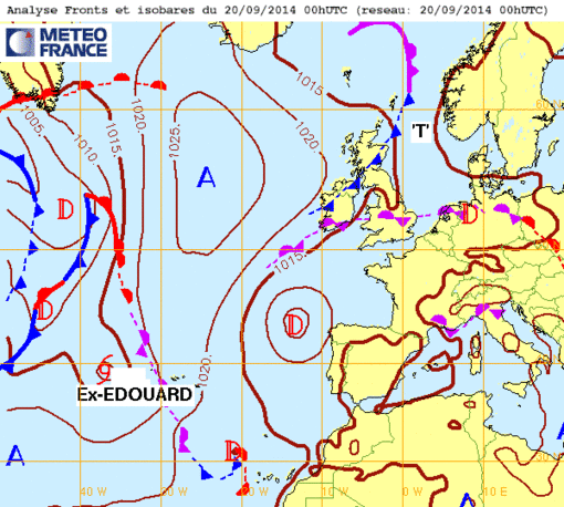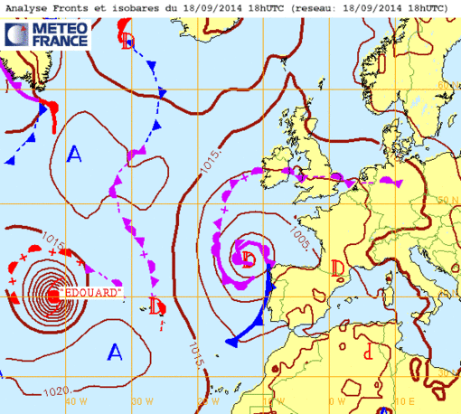 Ve 19 sept 14 à 11h00 : ...ou quand Edouard se retrouve en plein centre atlantique...mais il ne sera bientôt plus qu'une simple Tempête Tropicale car il se comble et rapidement le pauvre ! (voir Cyclones )