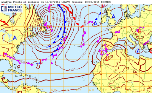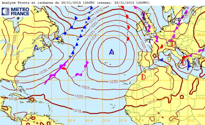 Je 26 nov 15 à 12h00 : Vaste anticyclone à deux cellules(1040 et 1046mb) couvrant tout l'atlantique Nord, l'Ouest des USA et du Canada, le NW de l'Afrique et du Sahara (la 1015mb reliant Belfast, Paris, Barcelone, Tunis, Dakar, les Antilles...)