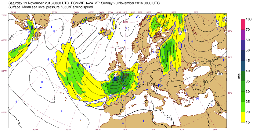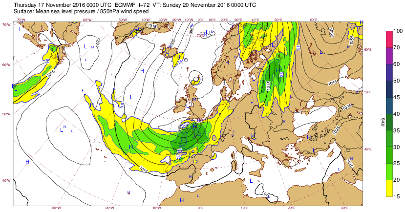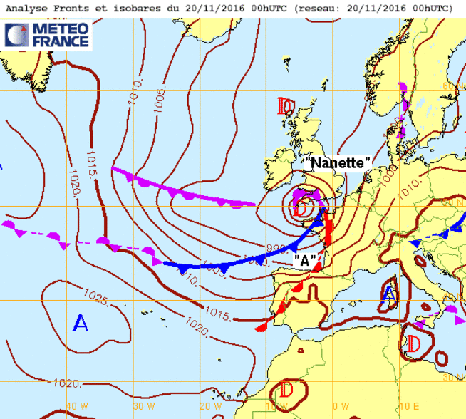 Je 17 nov 16 à 11h00 : Une dépression ("Nanette") sans doute localement tempétueuse (raf >90kmh) est prévue se creuser le di20 à 00htu pour se desserrer le lendemain (atténuation des vents) et se creuser à nouveau le surlendemain sur la Manche... J-3 :