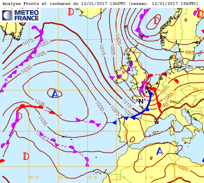 Ma 29 jan 16 à 11h00 : Voici donc la carte de la situation isobarique observée :