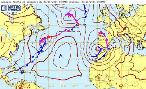 Sa 29 nov 14 à 11h00 : ... C'est la saison où les minimums atltantiques "descendent" jusqu'au Maroc et dont les perturbations associées vont concerner quasiment toute l'AFN !