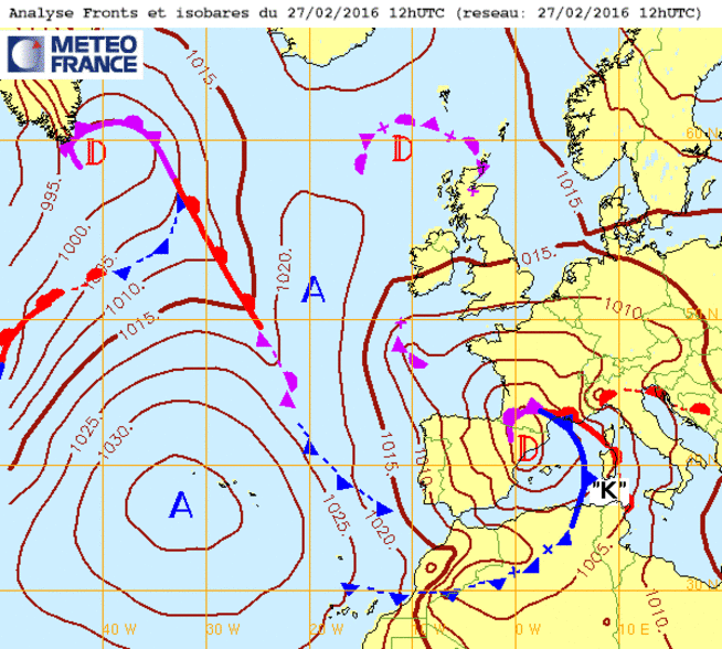 Di 28 fév 16 à 11h00 : Magnifique cyclone méditerranéen ou quand Barcelone (985mb) mène la danse !