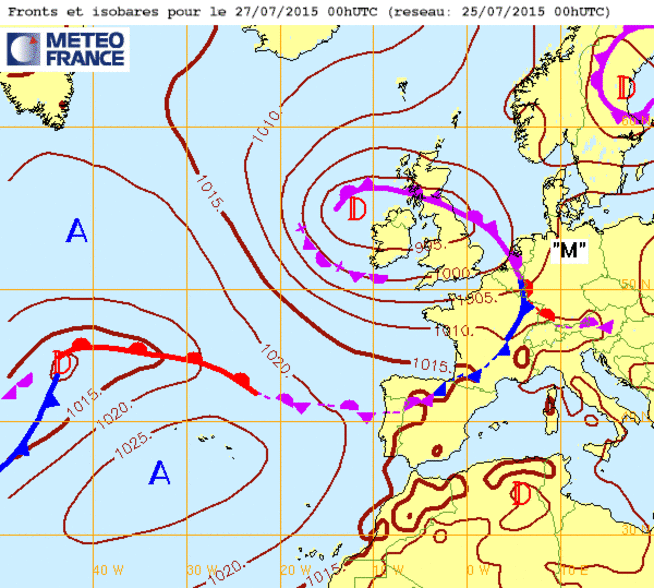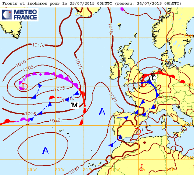 Ve 24 juil 15 à 11h00 : ..Petit Coup de Vent d'été par une dépression (998mb) très proche, longeant la Manche, pour demain sa25 :