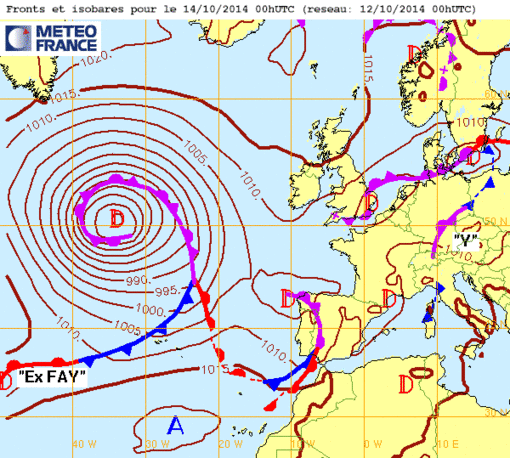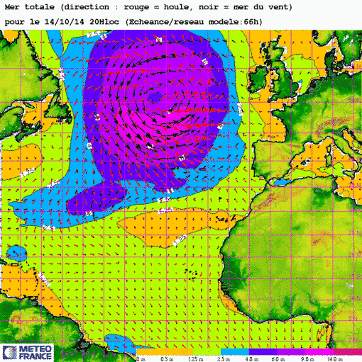 Di 12 oct 14 à 11h00 : ...un autre se creuse à nouveau mais devrait également nous parvenir assez atténué...En attendant il génère bel et bien une "très grosse mer"(9-14m) sur le centre atlantique...