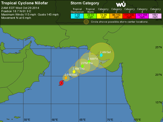 Me 29 oct 14 à 11h00 : ...si les cyclones semblent devenus plutôt rares su l'AN, ils sont en revanche plus fréquents et plus intenses sur l'océan indien comme ci-dessous en ce moment avec "Nilofar" de catégorie 3/5 (voir cyclones )