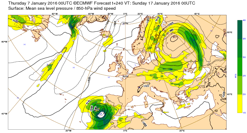 Je 7 jan 16 à 11h00 : Une dépression tempétueuse assez marquée semble devoir intéresser les côtes marocaines et le sud-est de la péninsule ibérique le di17-1-16 soit à J-10 : qu'en sera-t-il dans 10 j ? (Réponse ci-dessous)