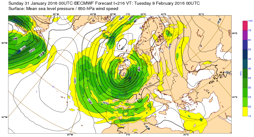 Di 31 jan 16 à 11h00 : C'est une fameuse dépression qui nous est encore annoncée là pour le ma9 fév ! Mais à J-9 il n'est creux qui ne se comble ou même disparaît complètement ! (ci-dessous ve29). Attendons de voir...(cf. ci-dessous)