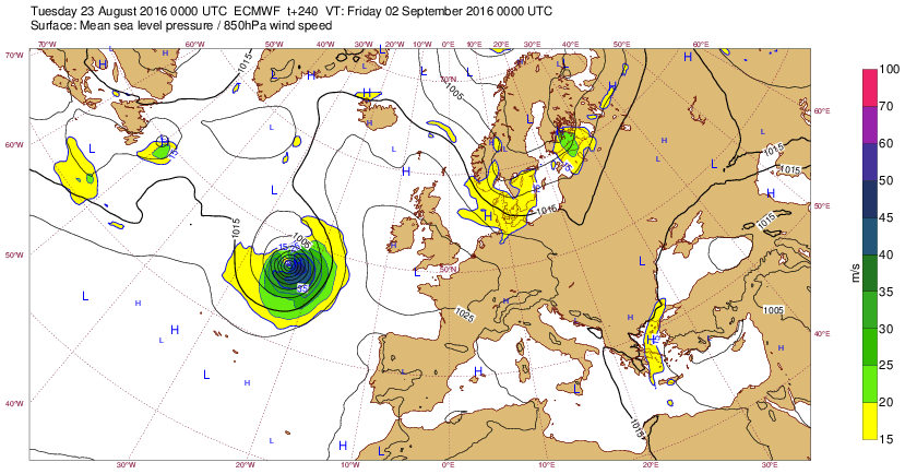 Ma 23 août 16 à 11h00 : Et voici qu'aujourd'hui à (J-10)(t+240)(situation prévue le ve2sep à00h), on nous promet un vieux cyclone des familles (970mb au centre) s'approchant, comme souvent en cette saison, des côtes occidentales. Jusqu'où ira-t-il celui-là ? ...