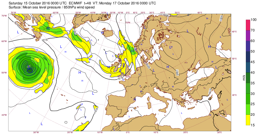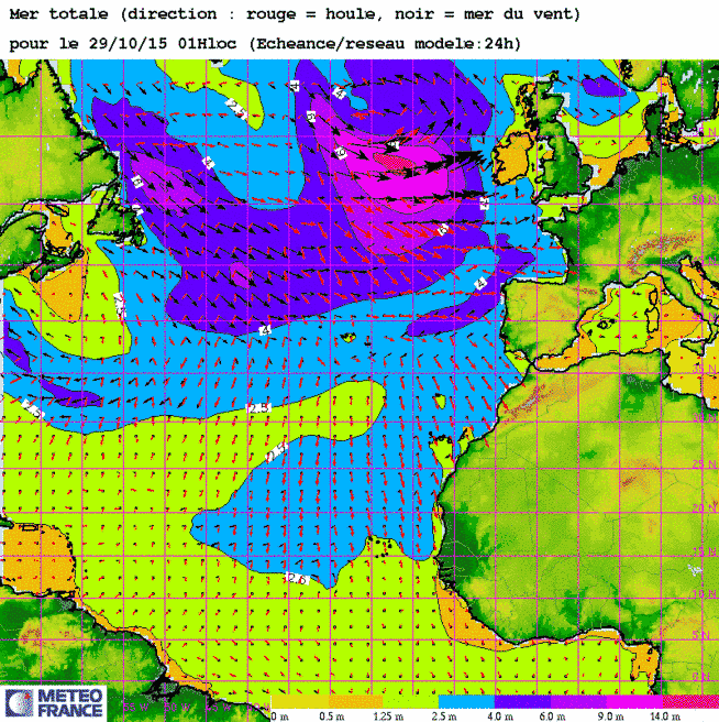 Me 28 oct 15 à 12h00 : ..Une cellule de mer énorme (>14m) au large de l'Irlande pour la journée du je 29 oct ! (Devrait s'étaler et seule une mer grosse (6-9m) devrait toucher les côtes de l'île au trèfle !