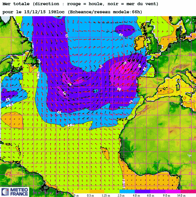 Di 13 déc 15 à 12h00 : Une cellule de mer Très Grosse (9-14m) s'approche de l'entrée de Manche ouest et de Sud-Irlande...