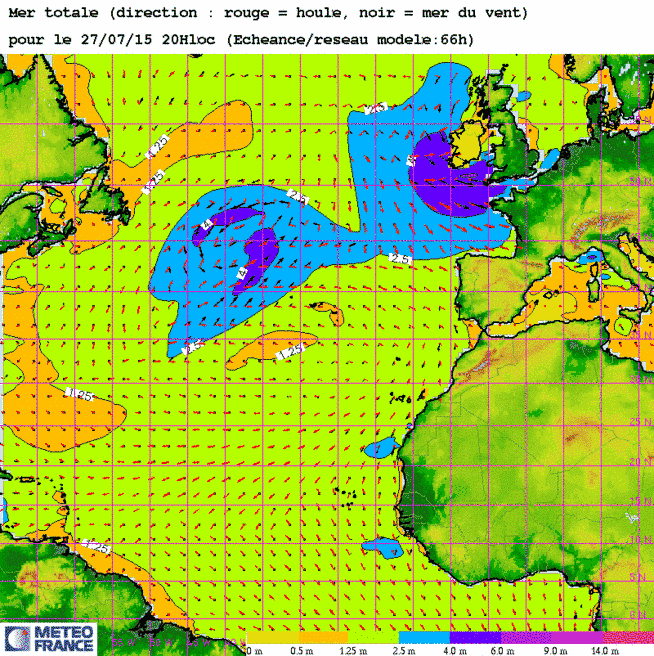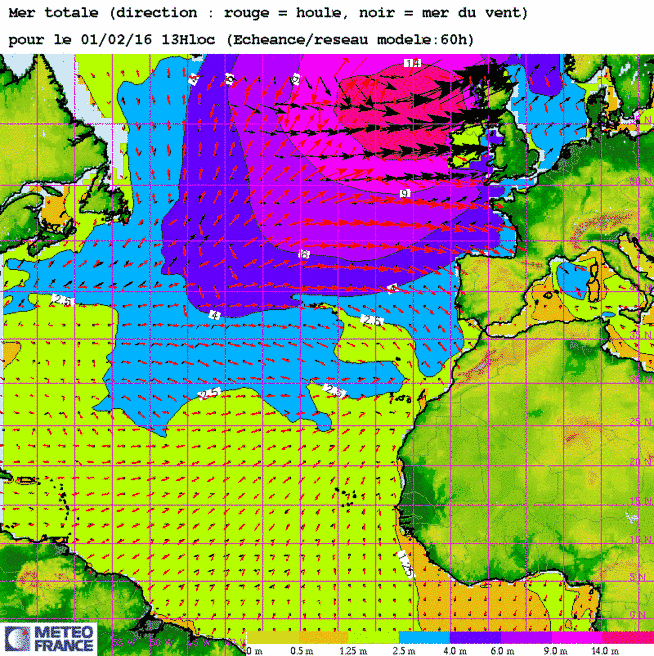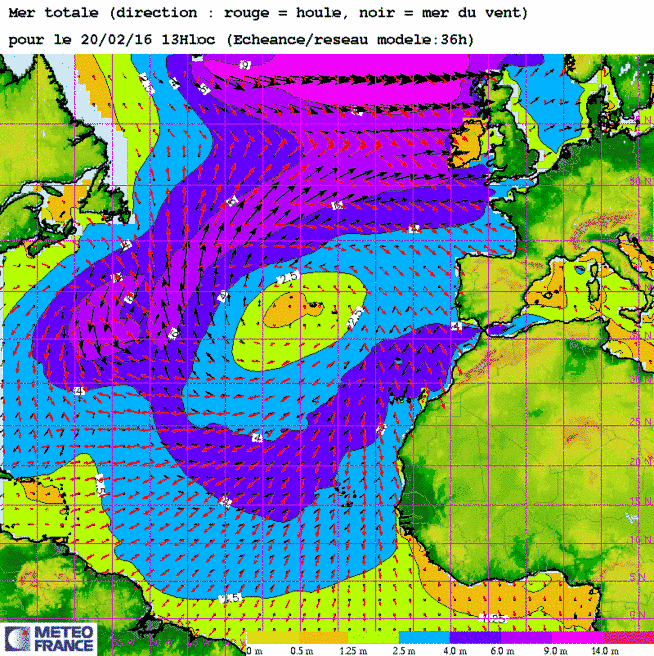 (pour mémoire) Ma 4 fév 14 à 12h00 : A nouveau une mer "énorme"(>14m) cette fois-ci jusqu'à l'entrée de Manche Ouest !