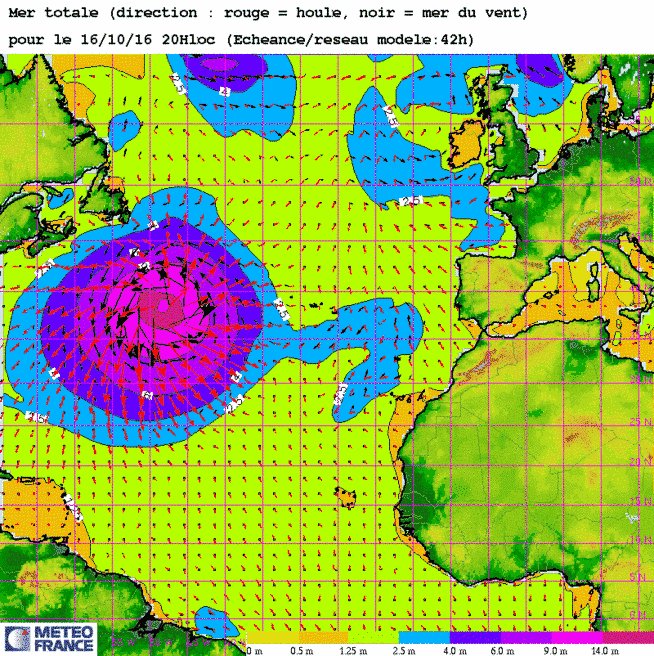 Sa 15 oct 16 à 11h00 : Cette fois-ci c'est la charmante Nicole une belle bien creuse (950mb) qui engendre au coeur de l'Atlantique une vaste zone de mer au moins forte (4m) avec au centre une cellule de mer énorme (>14m) .